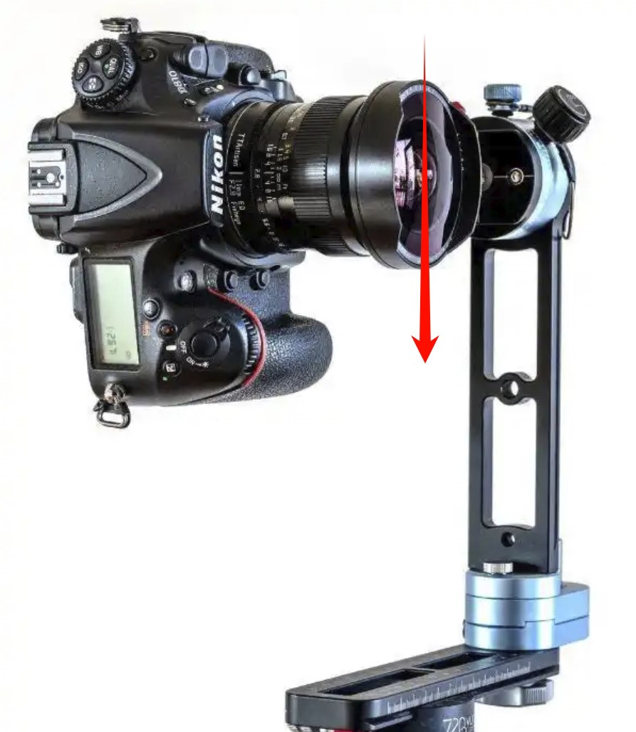 在我们进行合肥VR全景拍摄的过程中,除了部分要求不高的使用VR全景相机外,合肥专业的都是用专业相机,我们在使用专业相机的时候,必不可少的就是VR云台,在长时期用过VR云台的人我想都会遇到一个相当无语的问题:拍摄过程中会出现相像镜头向正下文下垂,如下图箭头方向下垂。